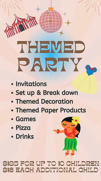 Themed birthday parties are always a hit. We will supply themed invitations, decorations and paper products. We will play games and have crafts centered around your theme.